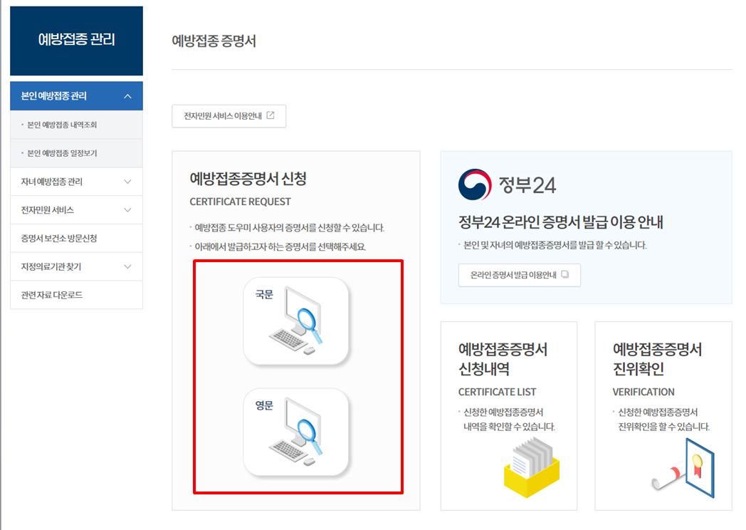 발급하려는 예방접종 증명서 국문,영문 버전 선택