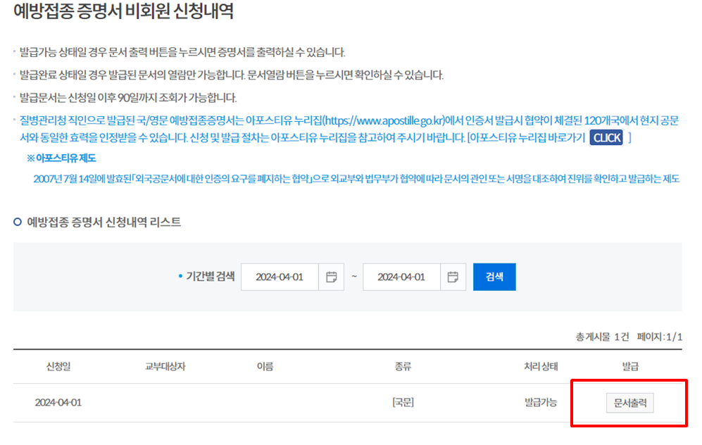 예방접종 증명서 신청내역 확인 -> 문서출력 클릭하면 PDF저장 가능