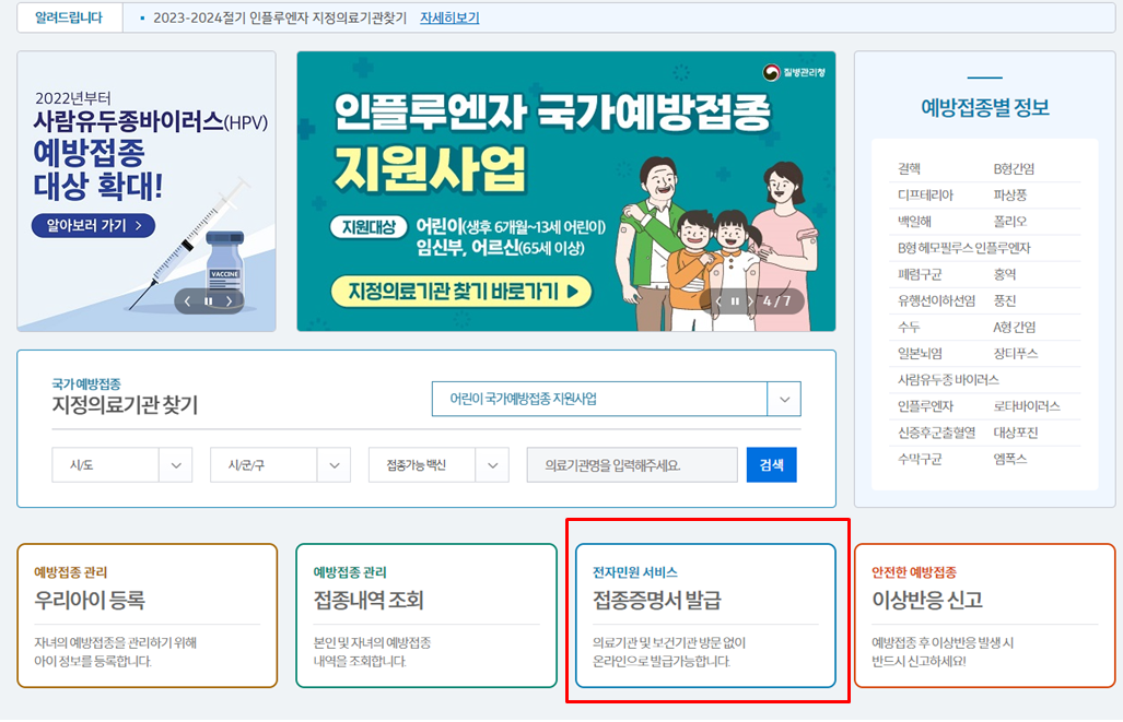 <질병관리청 예방접종 도우미>에서는 본인 및 자녀 예방접종 증명서 발급이 무료로 가능하며 지금까지의 예방접종 내역도 확인할 수 있습니다