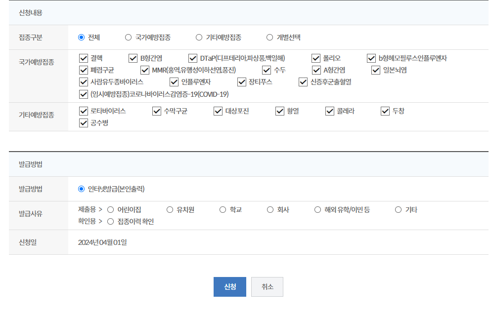 접종구분-> 접종 내역> 발급사유 선택 후 신청