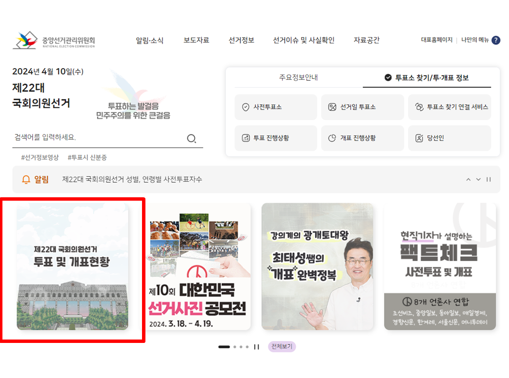 제 22대 국회의원 선거 투표 및 개표현황은 총선 특집페이지에서 확인할 수 있습니다